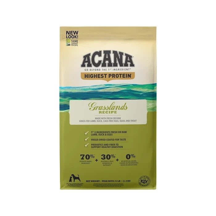 Εμπνευσμένη από τα απέραντα λιβάδια και τις βόρειες λίμνες του Καναδά η ACANA GRASSLANDS χαρακτηρίζεται από φρέσκο αρνί, ελευθέρας βοσκής πάπια και ολόκληρα αβγά από φωλιές, λούτσο αλιευμένο στη φύση και γαλοπούλα ελευθέρας βοσκής από τον δυτικό Καναδά. Η ACANA GRASSLANDS ξεχειλίζει από φρέσκα τοπικά συστατικά που παραδίδονται καθημερινά στις κουζίνες μας ΦΡΕΣΚΑ ή ΩΜΑ σε WholePrey™ αναλογίες για να αντικατοπτρίζει τη φυσική διατροφή του σκύλου σας και να τον θρέψει πλήρως και όπως προόριζε η φύση. Είναι μια συνταγή με περιορισμένους υδατάνθρακες, αλλά πλούσια σε πρωτεΐνη για να προάγει βέλτιστη φυσική κατάσταση στους σκύλους όλων των φυλών και όλων των σταδίων ζωής.