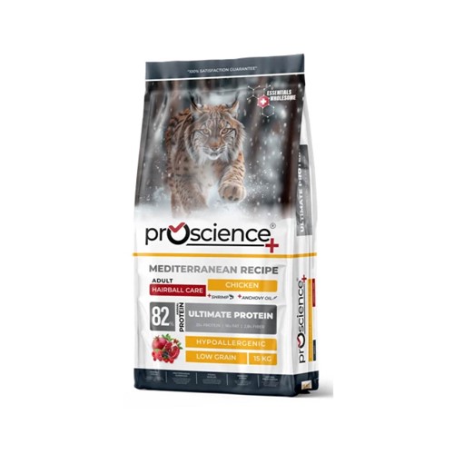 Ξηρά Τροφή Γάτας Proscience Adult Hairball Care Κοτόπουλο. Η τροφή για γάτες Proscience Chicken Adult προσφέρει πλήρη και ισορροπημένη διατροφή για την ενήλικη γάτα σας χάρη στην υποαλλεργική, χαμηλής περιεκτικότητας σε δημητριακά φόρμουλά της. Περιέχει 82% ζωική πρωτεΐνη και βοηθά στον έλεγχο των τριχόμπαλων. Υγεία με τη δύναμη της Μεσογείου: Αυτή η τροφή είναι εμπλουτισμένη με μεσογειακά φρούτα όπως κράνμπερι, βατόμουρα, σμέουρα και ρόδια. Τα κράνμπερι υποστηρίζουν την υγεία του ουροποιητικού συστήματος. Τα βατόμουρα έχουν υψηλή περιεκτικότητα σε βιταμίνες C και K. Τα σμέουρα βοηθούν στην πέψη και υποστηρίζουν τη διατήρηση ενός βέλτιστου βάρους. Το ρόδι είναι πηγή αντιοξειδωτικών και βιταμινών για ένα ισχυρό ανοσοποιητικό σύστημα. Για μια δυνατή και υγιή ζωή: Η πρωτεΐνη κοτόπουλου είναι μια απαραίτητη και εύπεπτη πηγή για τη διατήρηση των μυών. Το λάδι γαρίδας και αντσούγιας είναι πλούσιες πηγές Ωμέγα-3. Η ισορροπία των Ωμέγα-3 και 6 υποστηρίζει ένα πιο υγιές και λαμπερό τρίχωμα. Η ταυρίνη είναι ένα απαραίτητο αμινοξύ για την υγιή όραση, την καρδιά και την αναπαραγωγική υγεία.