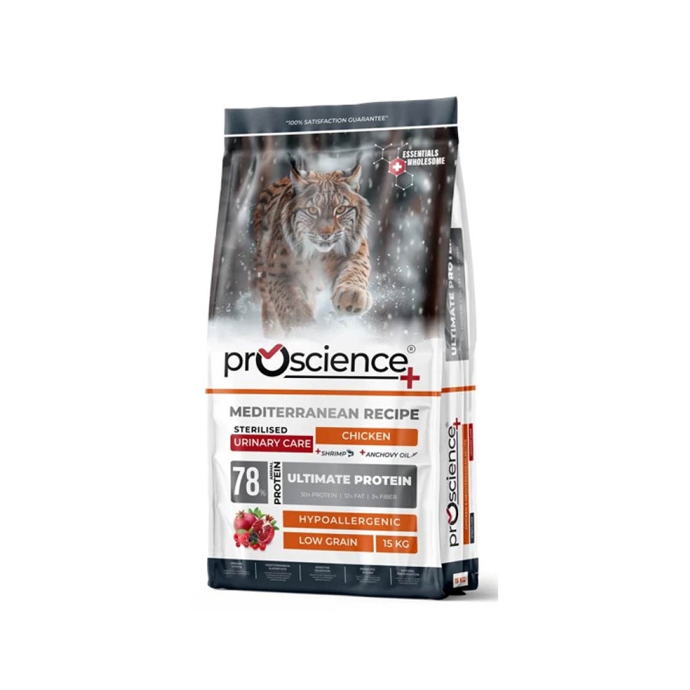 Ξηρά Τροφή Γάτας Proscience Sterilized Urinary Κοτόπουλο. Η τροφή για γάτες Proscience με κοτόπουλο παρέχει πλήρη και ισορροπημένη διατροφή για την στειρωμένη γάτα σας, χάρη στην υποαλλεργική και χαμηλής περιεκτικότητας σε σιτηρά σύνθεσή της που περιέχει 78% ζωική πρωτεΐνη. Υγεία με τη δύναμη της Μεσογείου: Αυτή η τροφή δημιουργεί μια φυσική προστατευτική ασπίδα για την υγεία του ουροποιητικού συστήματος με κράνμπερι, ενώ τα βατόμουρα ενισχύουν το ανοσοποιητικό σύστημα. Τα σμέουρα και τα ρόδια, με την υψηλή περιεκτικότητά τους σε φυτικές ίνες και αντιοξειδωτικά, βοηθούν στην πέψη. Ακρογωνιαίοι λίθοι υγιούς ανάπτυξης: Τα ωμέγα-3 από έλαιο αντσούγιας υποστηρίζουν τη γνωστική ανάπτυξη, καθιστώντας τη γάτα σας πιο έξυπνη και σε εγρήγορση.