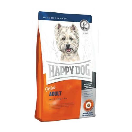 Για ενήλικα σκυλιά ως 10 κιλά σωματικού βάρους με κανονικές ανάγκες ενέργειας {26/14}. Βέλτιστη περιποίηση δοντιών με προσαρμοσμένη μικρή κροκέτα. Το Adult Mini περιέχει 26% πρωτεΐνες άριστης ποιότητας, υψηλής πεπτικότητας και προσαρμοσμένο λίπος 14% με απαραίτητα, ακόρεστα λιπαρά οξέα ωμέγα 3 και ωμέγα 6 από πολύτιμες ζωικές και φυτικές πηγές. Το ιδιαίτερο συνταγολόγιο σε προσαρμοσμένη μορφή κροκετών με το μοναδικό στο είδος του σχήμα Happy Dog Supreme LifePlus Concept® από φυσικά συστατικά είναι εξαιρετικά κατάλληλο για όλα τα ενήλικα σκυλιά ως 10 κιλά βάρους. Η περιεκτικότητα ενέργειας είναι προσαρμοσμένη για βέλτιστη κινητικότητα για περίπου 2 - 3 ώρες ημερησίως.
